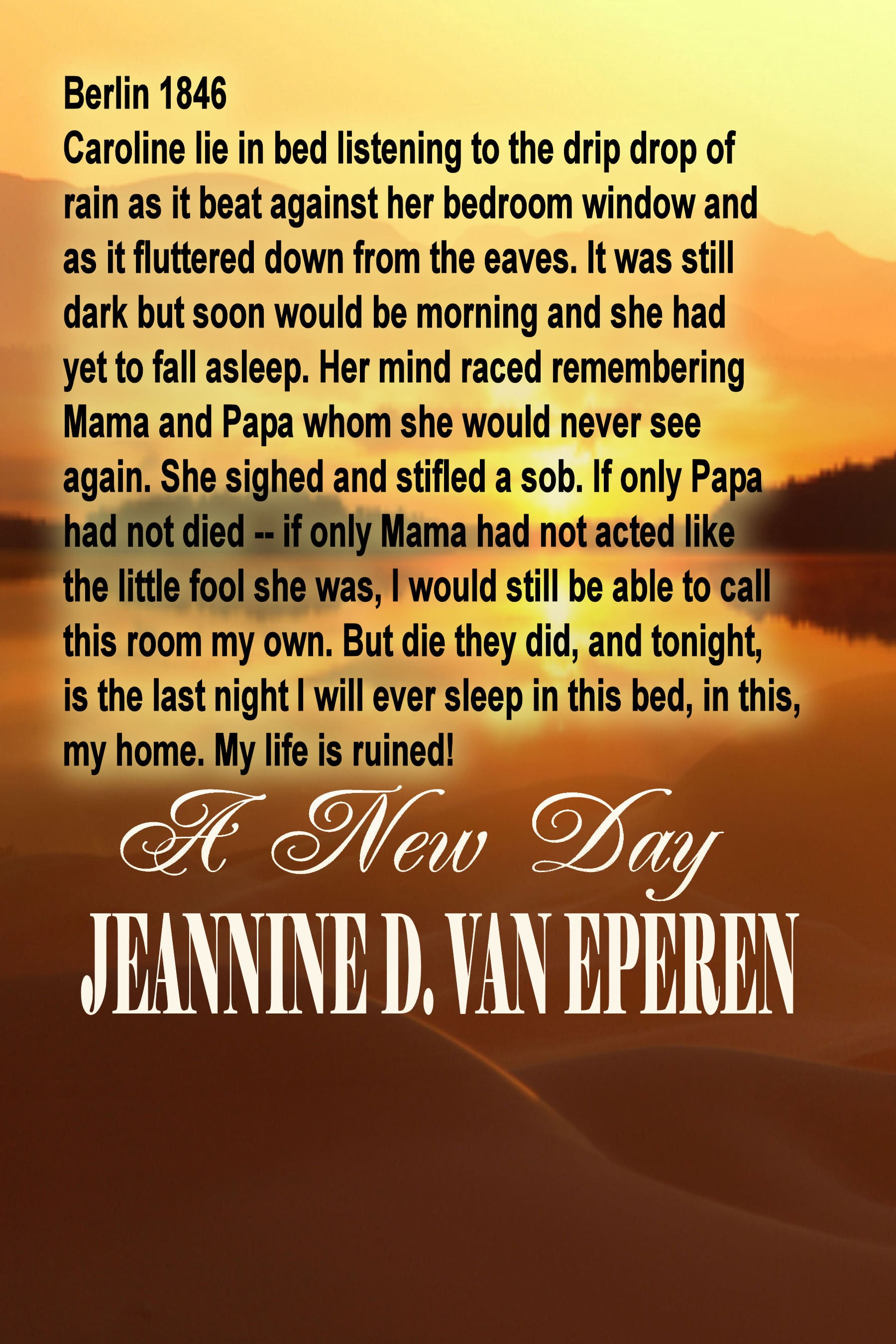 Caroline lie in bed listening to the drip drop of rain as it beat against her bedroom window and as it fluttered down from the eaves. It was still dark but soon would be morning and she had yet to fall asleep. Her mind raced remembering Mama and Papa whom she would never see again. She sighed and stifled a sob. If only Papa had not died -- if only Mama had not acted like the little fool she was, I would still be able to call this room my own. But die they did, and tonight is the last night I will ever sleep in this bed, in this, my home. My life is ruined!