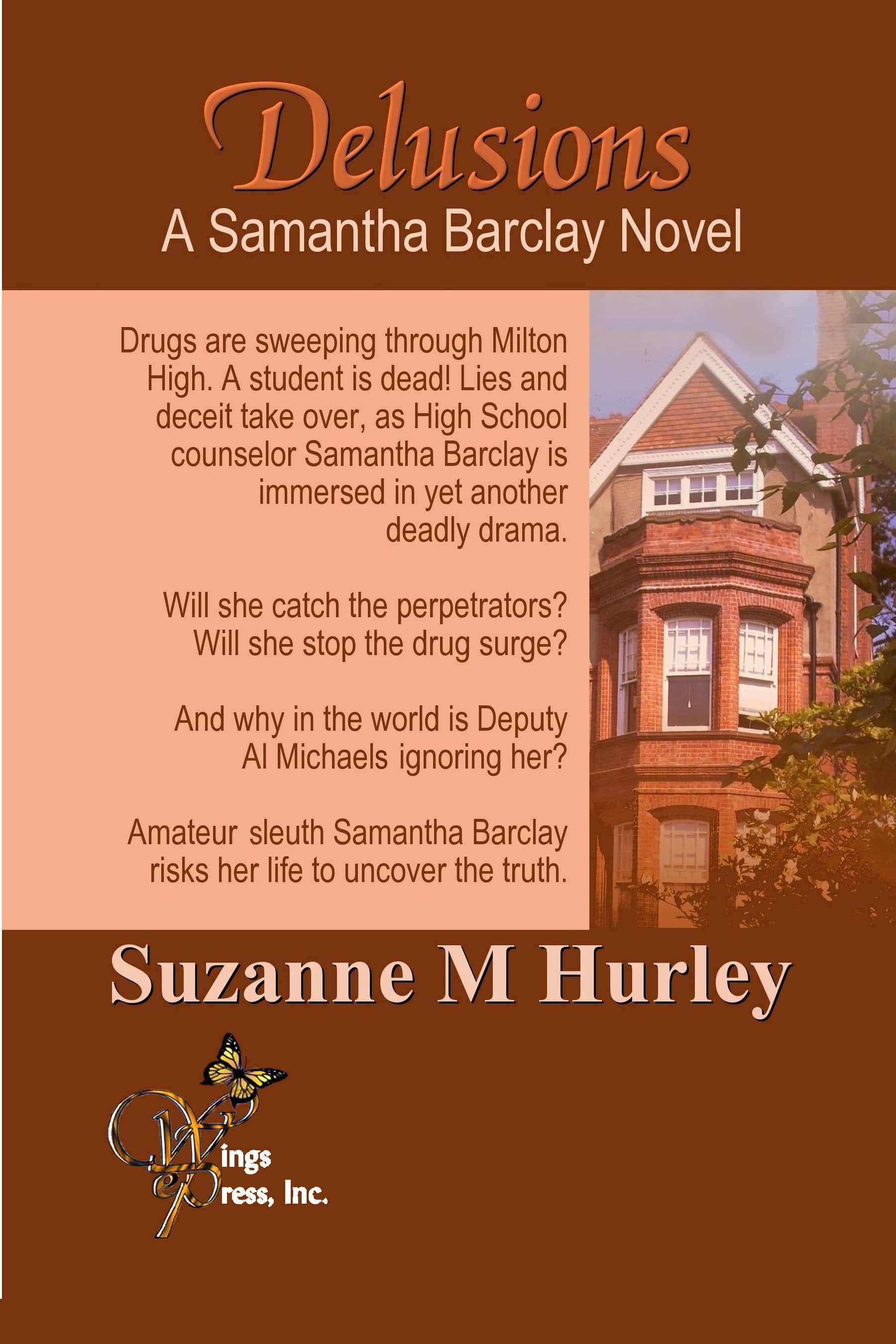 In Delusions, Suzanne M. Hurley creates another suspenseful Samantha Barclay Mystery, as the High School counselor once again gets into trouble when she gives in to her own natural curiosity to ferret out the truth. Why are her best people getting into drugs? Suzanne Hurley creates another suspenseful, page turning mystery where absolutely everyone appears to be the culprit.