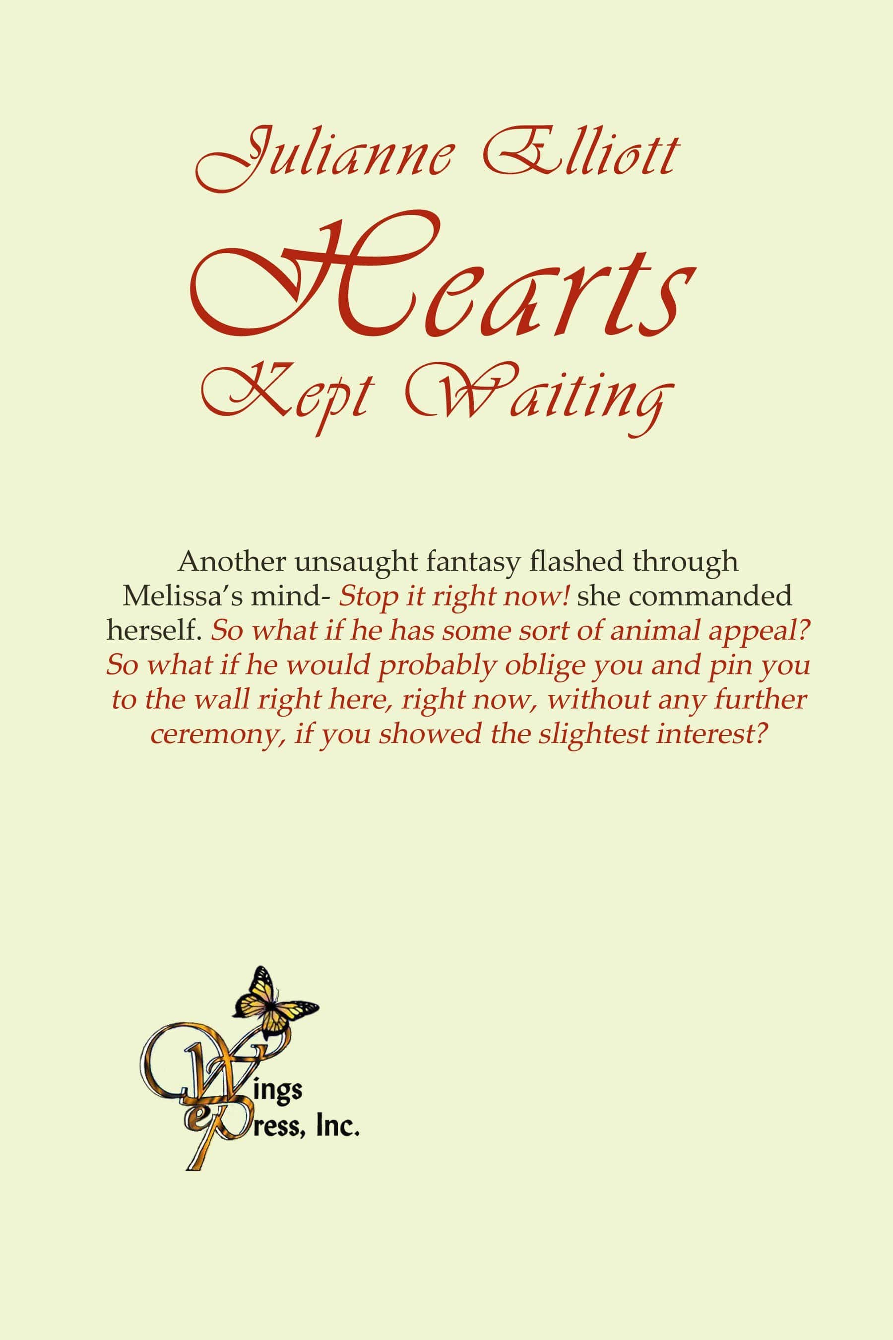 “Hearts Kept Waiting takes the reader on a delightful romp through Melissa Lagomarsino’s changeable heart as she’s hit broadside by love time and again. When she and Justin finally come together it’s passion, energy and—well, time for a cold shower.”