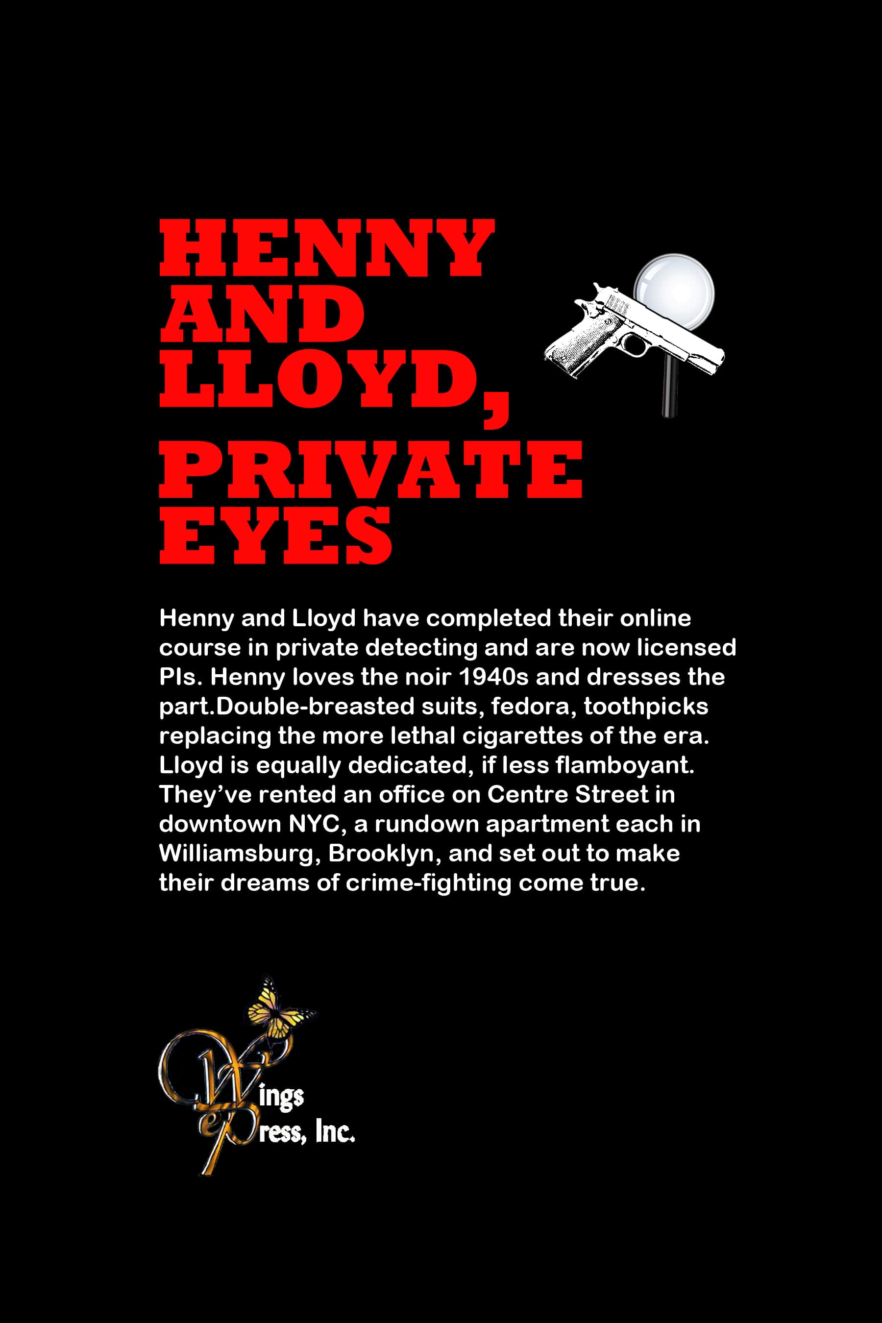 Henny and Lloyd, age mid-twenties, have completed their online course in private detecting and are now licensed PIs. They’ve found an office on Centre Street in downtown NYC, a rundown apartment each in Williamsburg, Brooklyn, and set out to make their dreams of crime-fighting come true. Henny especially loves the noir 1940s crime era and dresses the part. Double-breasted suits, fedora, toothpicks replacing the more lethal cigarettes of the era. Lloyd is equally dedicated, if less flamboyant. Attaining his current situation is especially gratifying to Lloyd since he had little encouragement from his family. When he told his father he planned to become a dick, his father replied that the only way he’d become a dick was if he changed his name to Richard. Lloyd was thankful the comment wasn’t any worse.