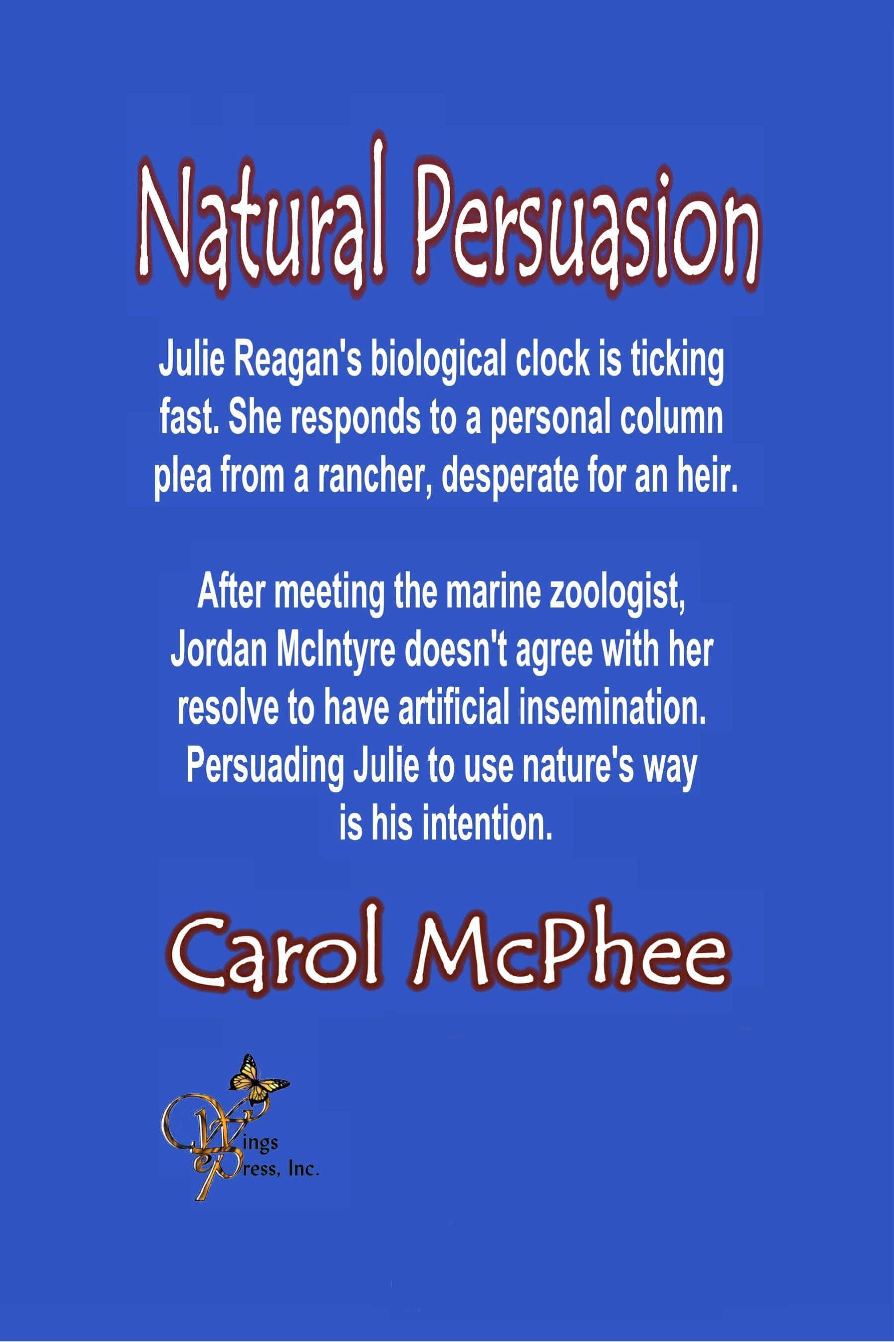 In Natural Persuasion, Carol McPhee serves us up a tortured hero, a lovable heroine, and an extremely believable storyline. Add just a spot of mystery, and this is a great read while relaxing in that big overstuffed chair in your living room. Try it!