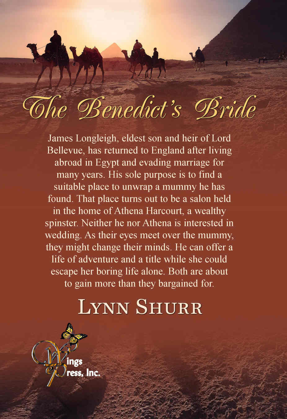 A benedict is defined as a man who marries late in life. In the final volume of the Longleigh Chronicles, The Benedict’s Bride, James Longleigh, eldest son and heir to the Bellevue title returns to England for the sole purpose of unwrapping a mummy he has discovered on his dig in Egypt. Ever averse to giving up his life of freedom and adventure for marriage, he has no plans to take a bride, even though he approaches forty.