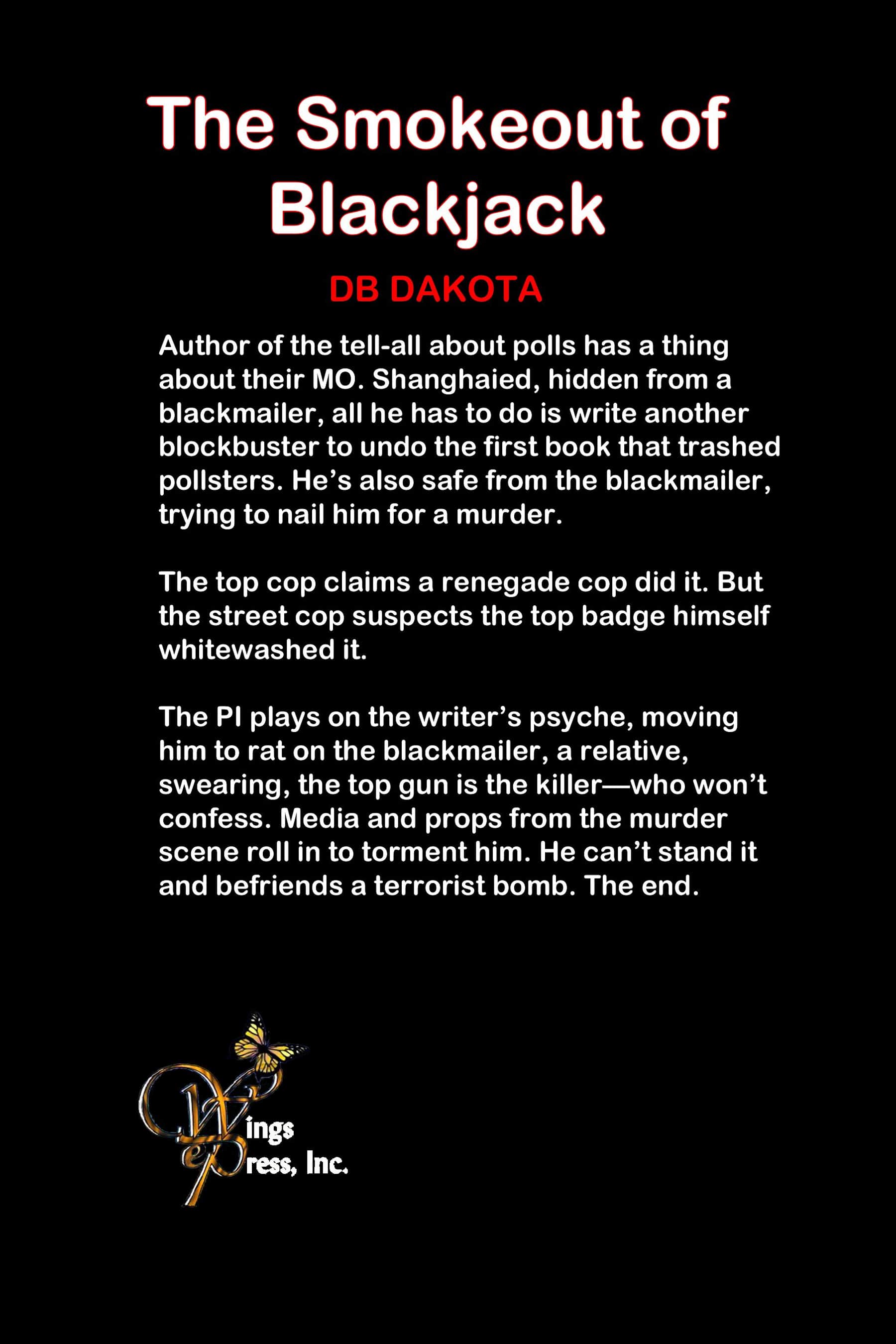 Author of the tell-all about polls has a thing about their MOs. Shanghaied, hidden from a blackmailer, all he has to do is write another blockbuster to undo the first book that trashed pollsters. He’s also safe from the blackmailer, trying to nail him for a murder. The top cop claims a renegade cop did it. But the street cop suspects the top badge himself whitewashed it. The PI plays on the writer’s psyche, moving him to rat on the blackmailer, a relative, swearing, the top gun is the killer—who won’t confess. Media and props from the murder scene roll in to torment him. He can’t stand it and befriends a terrorist bomber.